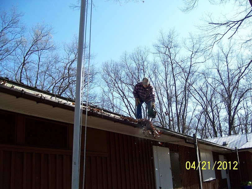 Duane Brown makes short work of cleaning the gutters on the dining hall on our work day. |